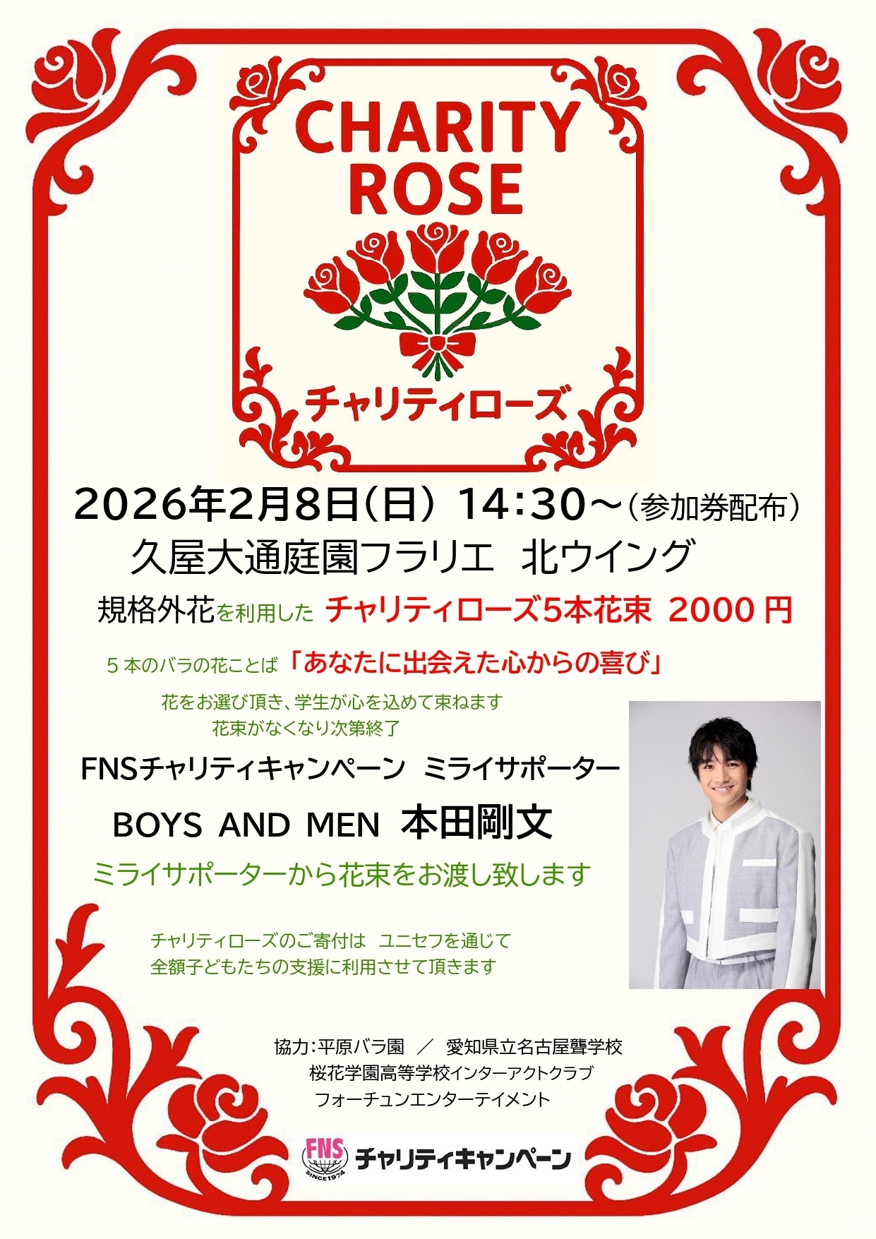 2/8(日)FNSチャリティーキャンペーン 『チャリティーローズ』イベント に 本田剛文が参加のお知らせ!