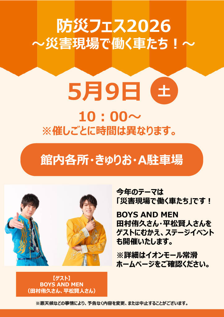 5月9日(土)イオンモール常滑で開催される「防災フェス2026」に田村侑久、平松賢人が出演致します。