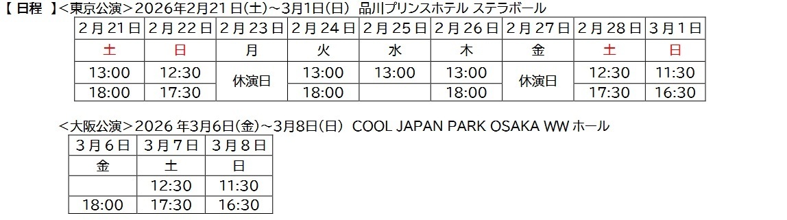 【 日程 】<東京公演>2026年2月21 日(土)〜3月1日(日) 品川プリンスホテル ステラボール